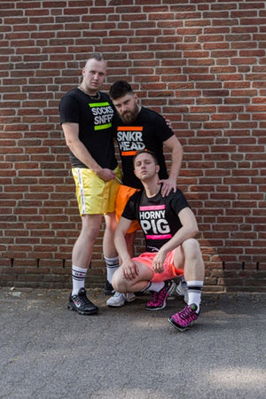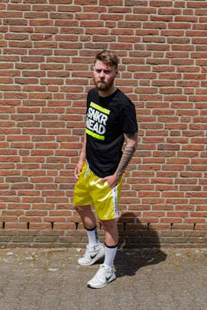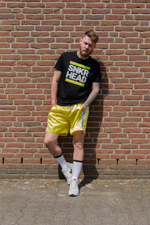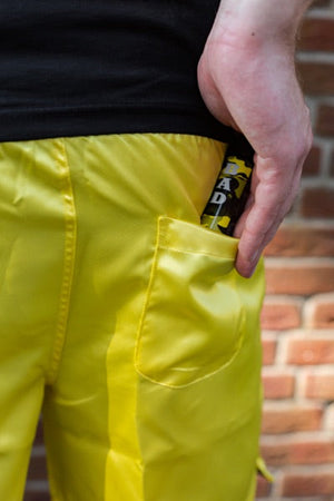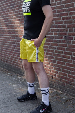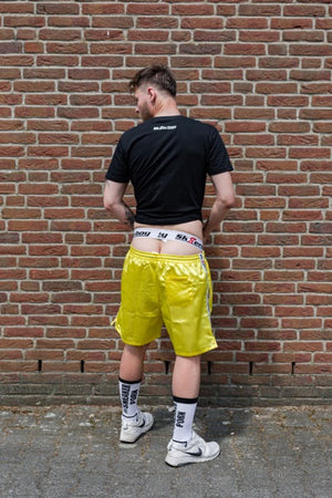 Unsere Sk8erboy® Sportshorts in gelb sind die perfekte Kombination aus Komfort und Fashion. Hergestellt aus leichtem Material, glänzen sie direkt im Fitnessstudio. Mit ihrem Sk8erboy Taillienband und Logo-Streifen sehen sie einfach geil aus und sorgen für einen versauten Anblick. Zudem sind die Shorts mit Seiten- und Rückentaschen sowie einem Innennetz ausgestattet, das verhindert, dass Ihr Geldbörse und Handy beim Training hin und her rutschen.